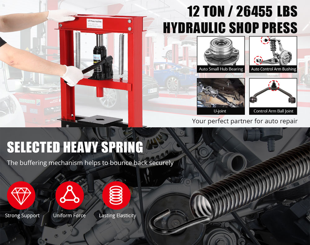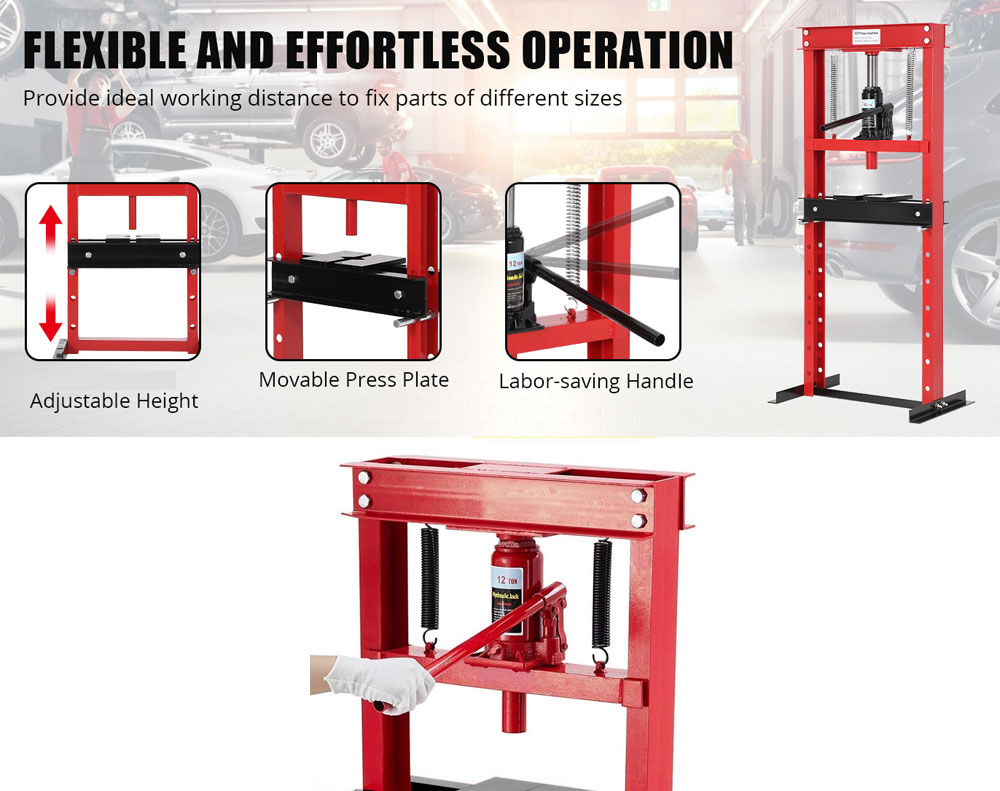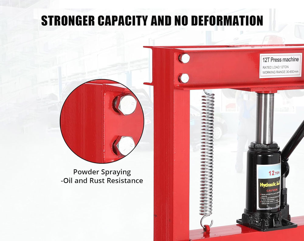12 Ton Heavy-Duty H-Frame Shop Press, 12,000kg Capacity Hydraulic Floor Press with 430mm x 650mm Throat, Red Powder Coated Steel for Bearings, Bushes, and Ball Joints