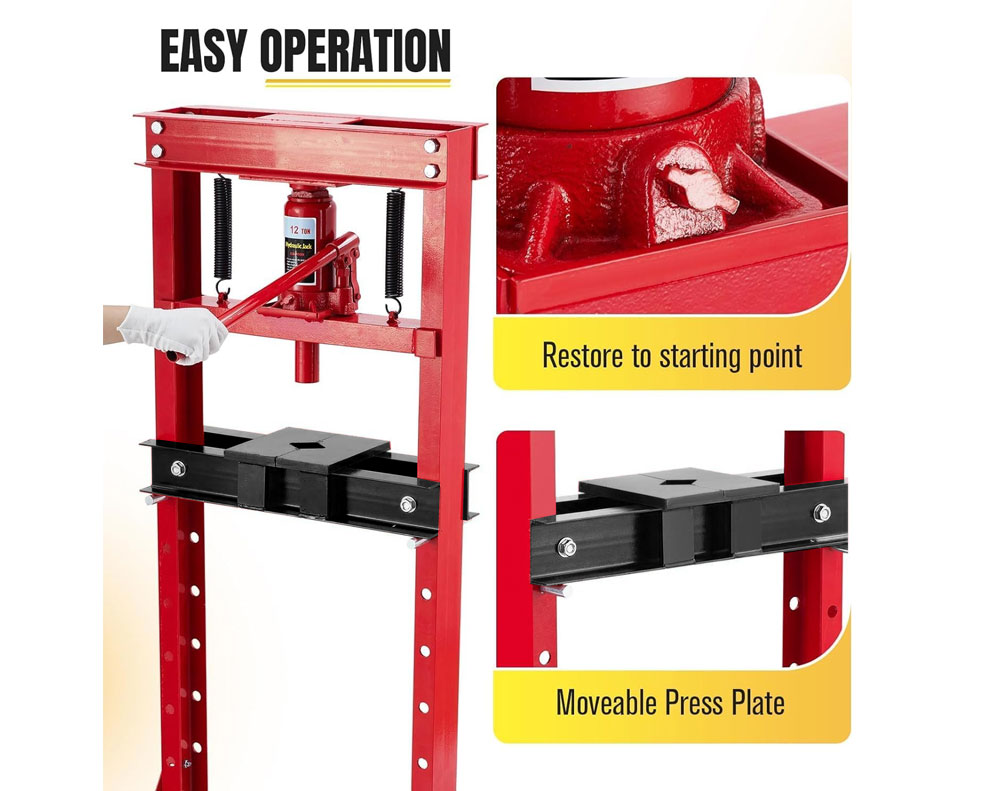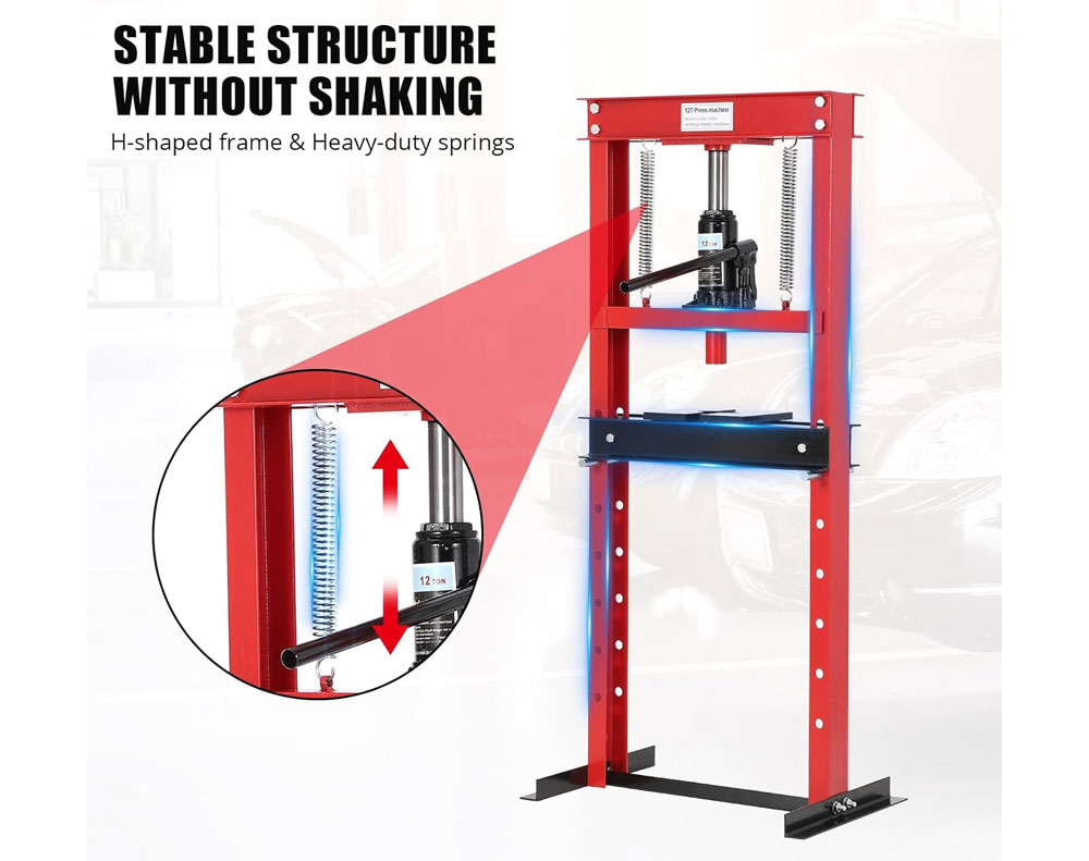This 12 Ton H-Frame hydraulic shop press allows home mechanics to press bearings, bushes, and ball joints with ease. Built from heavy-duty steel with a corrosion-resistant powder coating, it features a wide 430mm throat and 650mm height for versatile automotive repair tasks