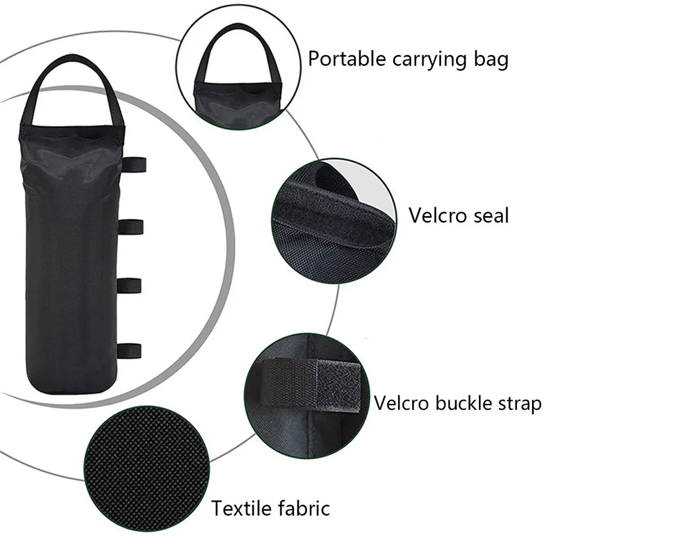 Sand Bags for Tent Crafted from durable 600D oxford fabric, they're built to withstand the elements. Each Sand Bags for Heavy Duty bag can accommodate up to 28 lbs of sand, rock, gravel, snow, dirt, or other materials. Sand Bags for Camping Equipped with a handle and 4 Velcro straps, These Sand Bags for Beach ensure a secure attachment to your Instant Canopy legs.