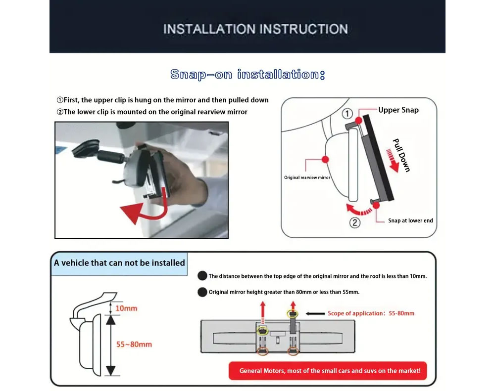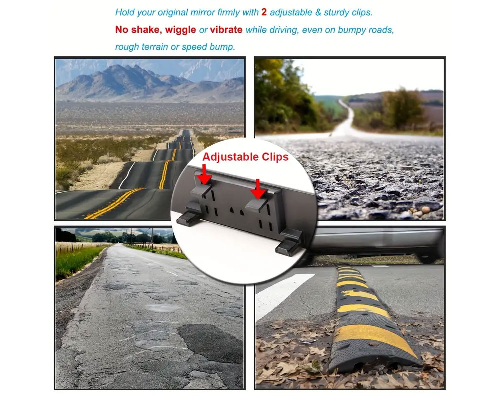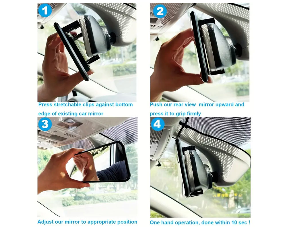 * Clip on to any original rear view mirror, just one-touch and add-on to the stock rearview mirror of your car, and there you go!