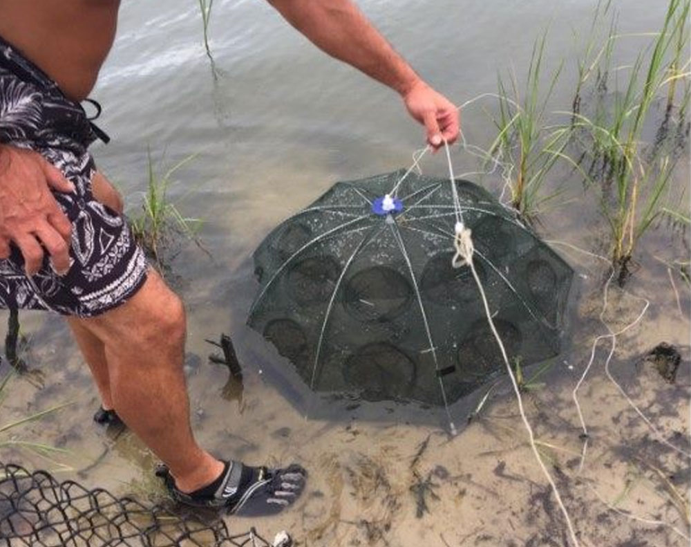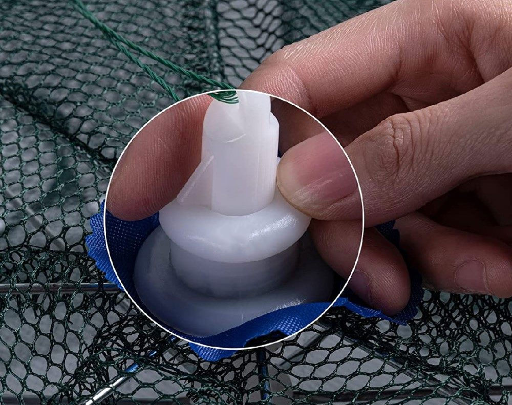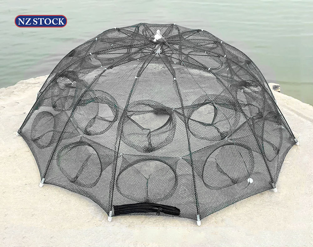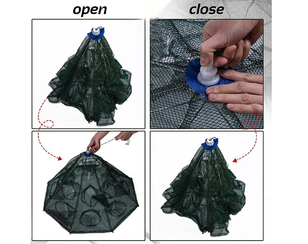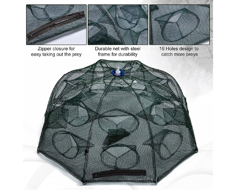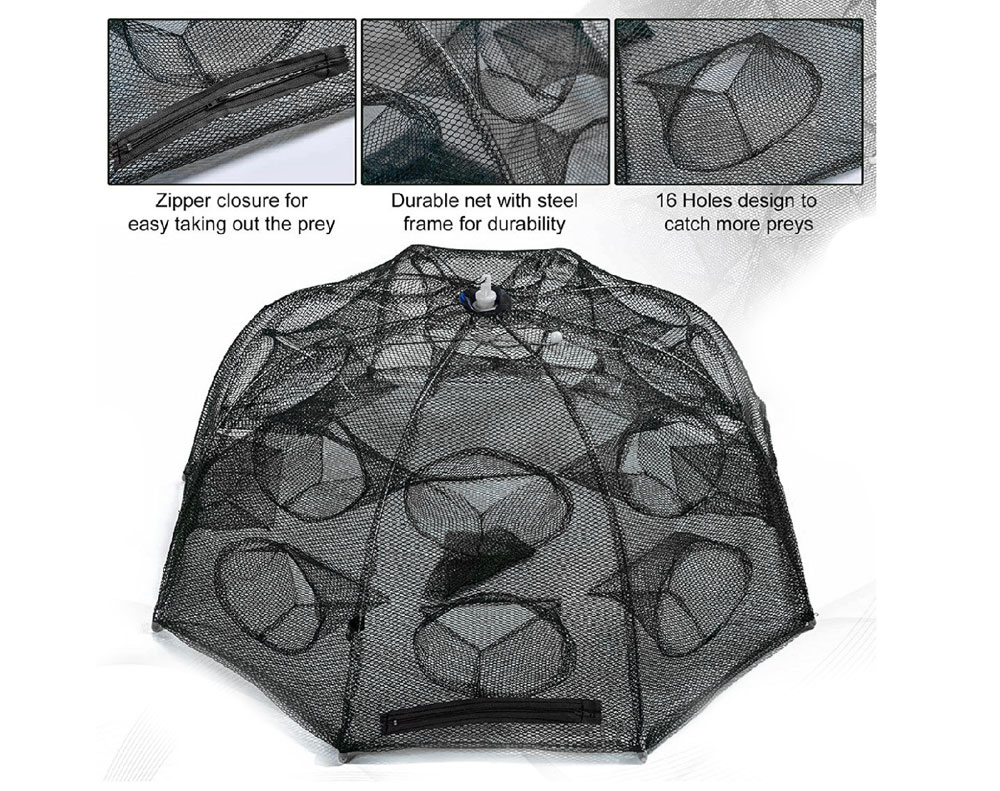 Double Decker Crab Cage Portable and durable folding crab cage with 16 holes and double decker design. Portable Foldable Crab Trap Easy to use and fold, great for catching smelt, crab, lobster, minnows, shrimp, and crawfish.