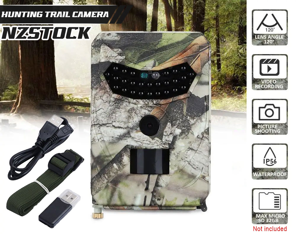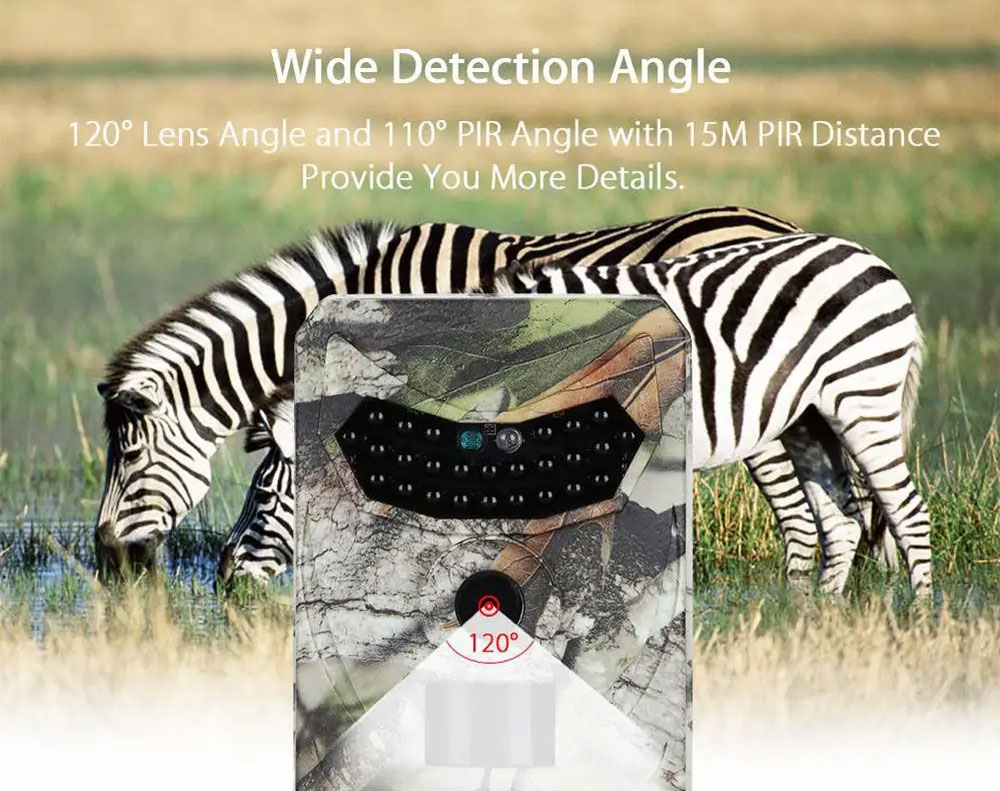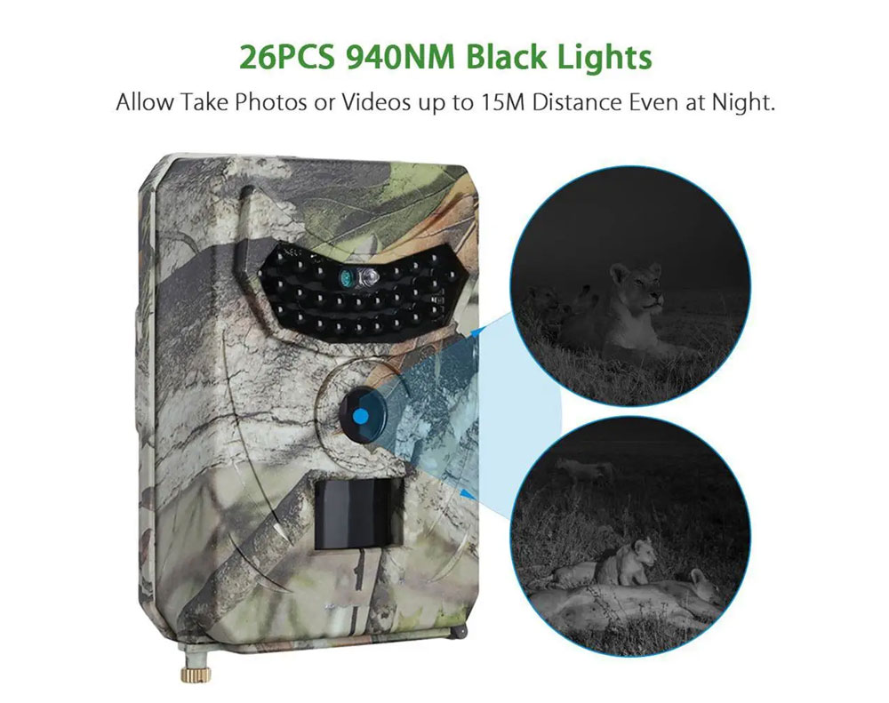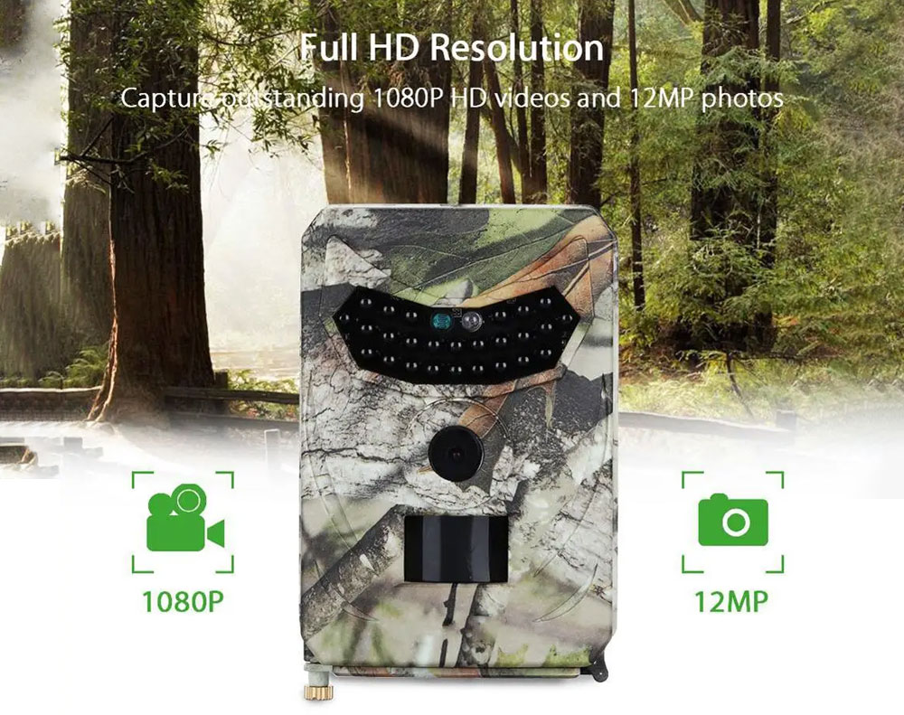 Capture stunning wildlife images with this 12MP Trail Camera. It records clear 1080P video and features a 15M night vision range using 26 stealth 940nm IR LEDs. With a rapid 1S trigger time and wide 120° lens, you won't miss any action. IP56 waterproof and powered by 4 AA batteries, it offers up to 12 months standby for reliable, year-round scouting