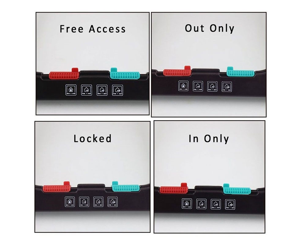 * 4 way door control with magnets between the 2 switches for aligning the flap a) No entry and no exit (completely closed) b) Can go in and out (completely open) c) Only in but not out d) Only going out but not in