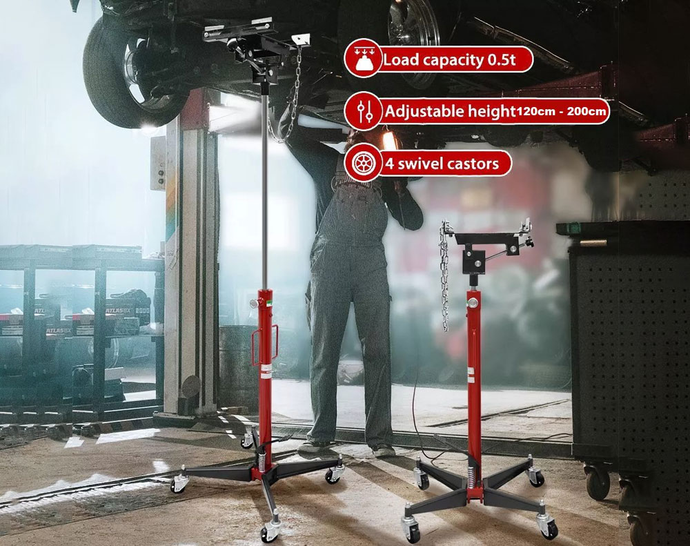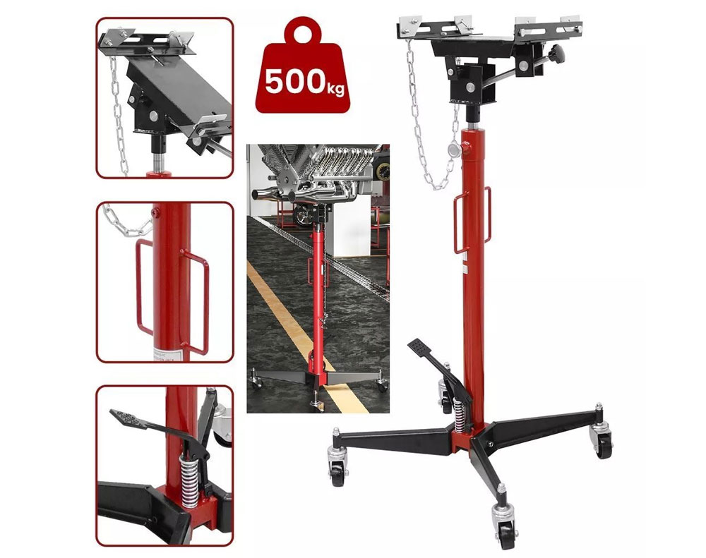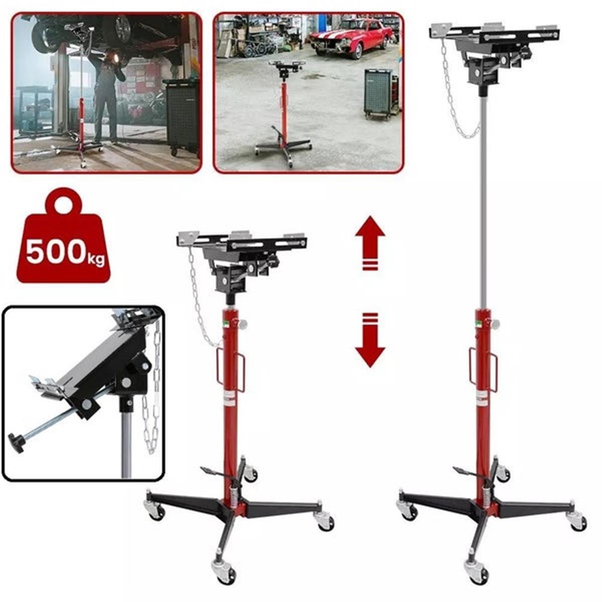 500kg Heavy Duty Pit Style Transmission Jack, High Lift 1200mm-2000mm Gearbox Jack with 60° Universal Pivot Saddle, Foot Pump, and Safety Chain
