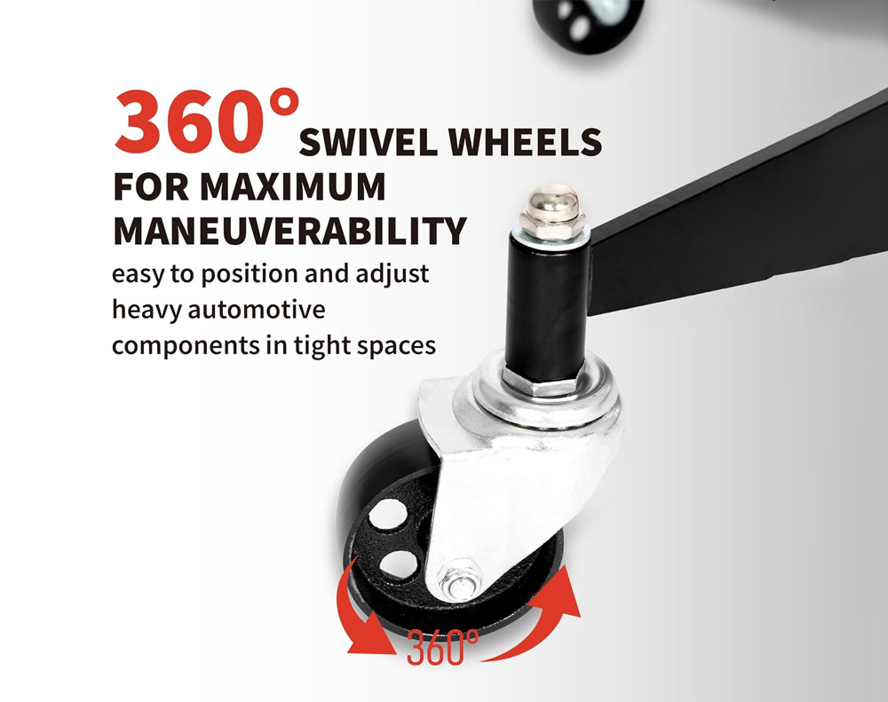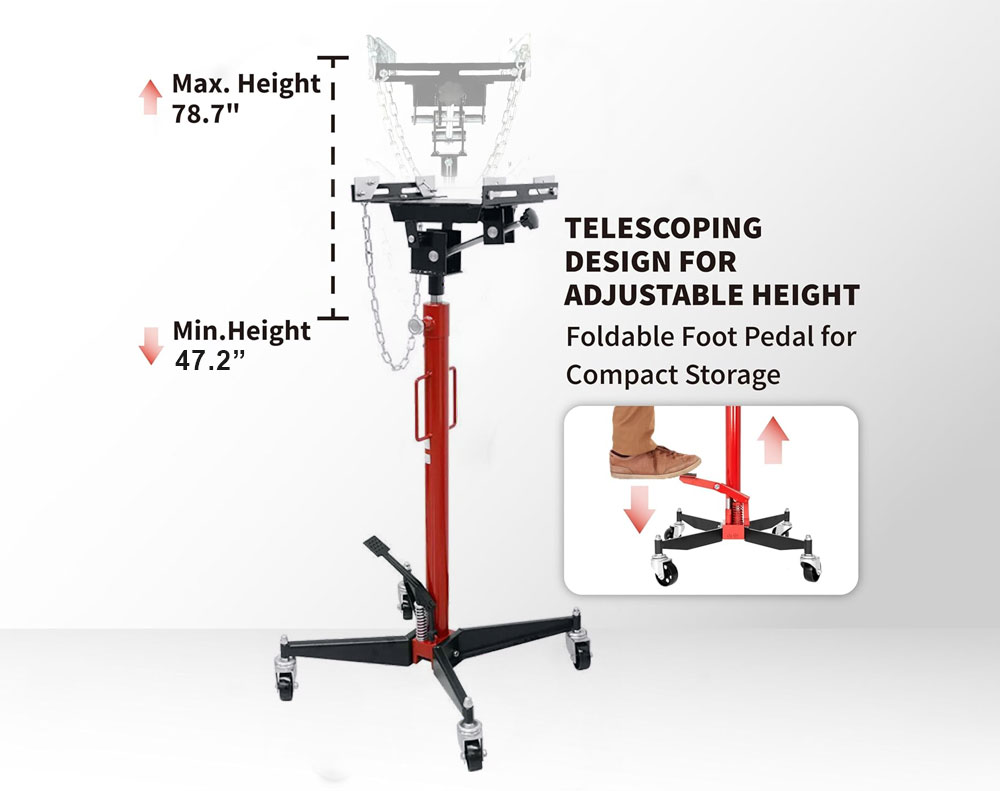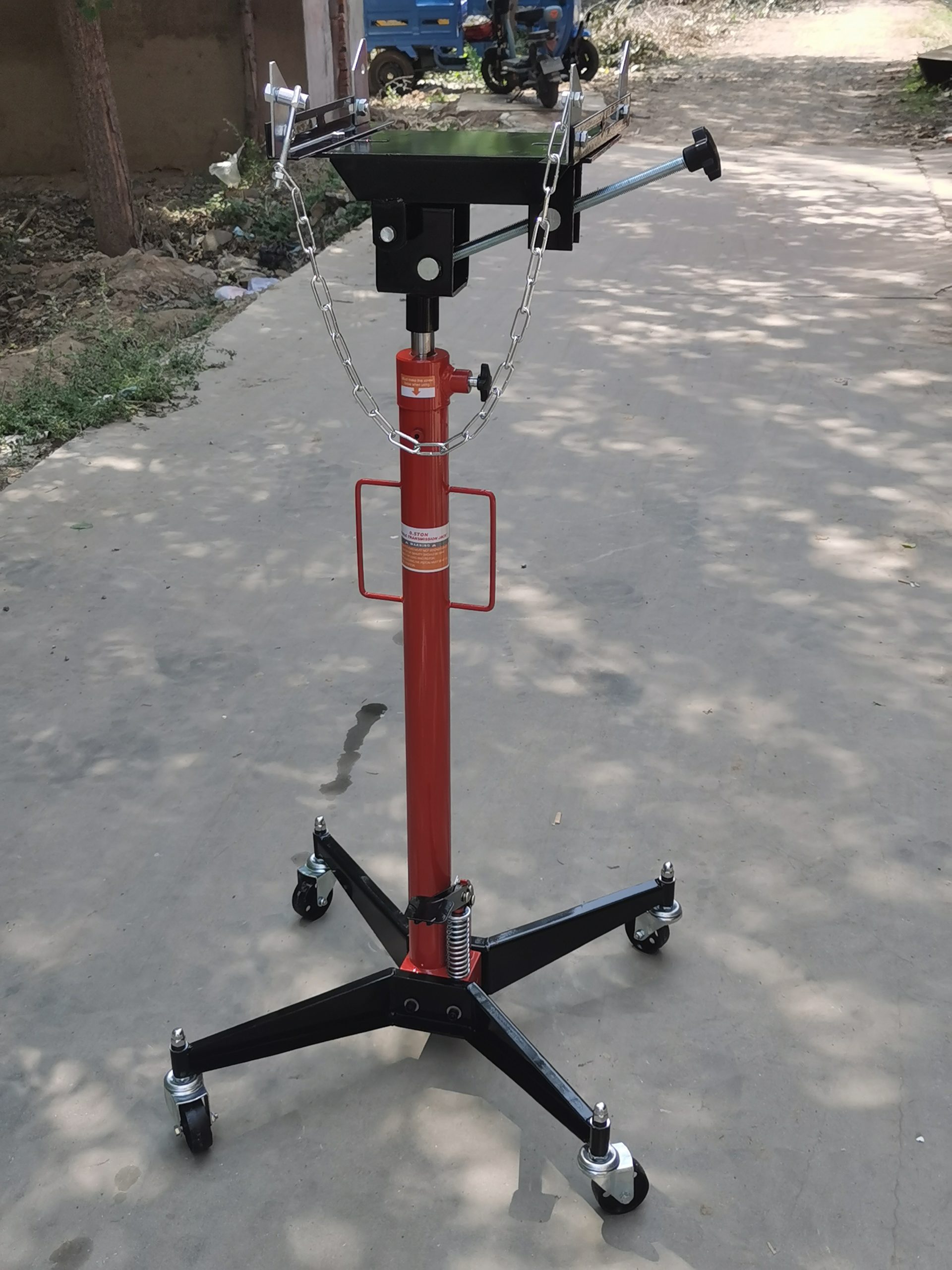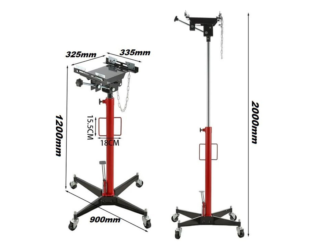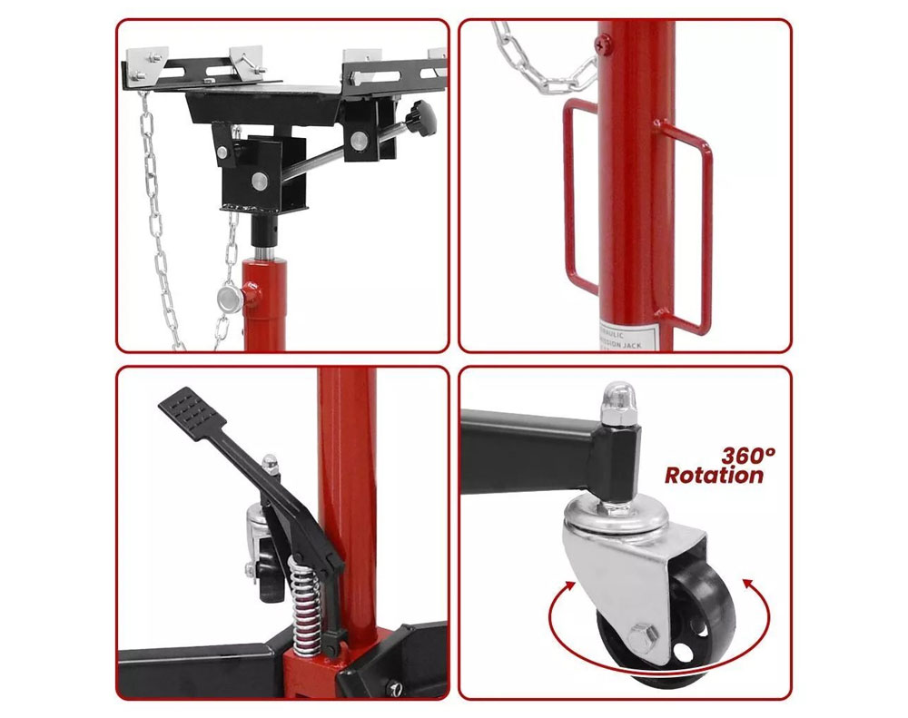 This heavy-duty pit style transmission jack is designed for safe lifting, positioning, and installation of gearboxes, differentials, and transfer cases. Featuring a foot-operated hydraulic pump, adjustable pivot saddle, and controlled lowering, it is ideal for workshops and garages